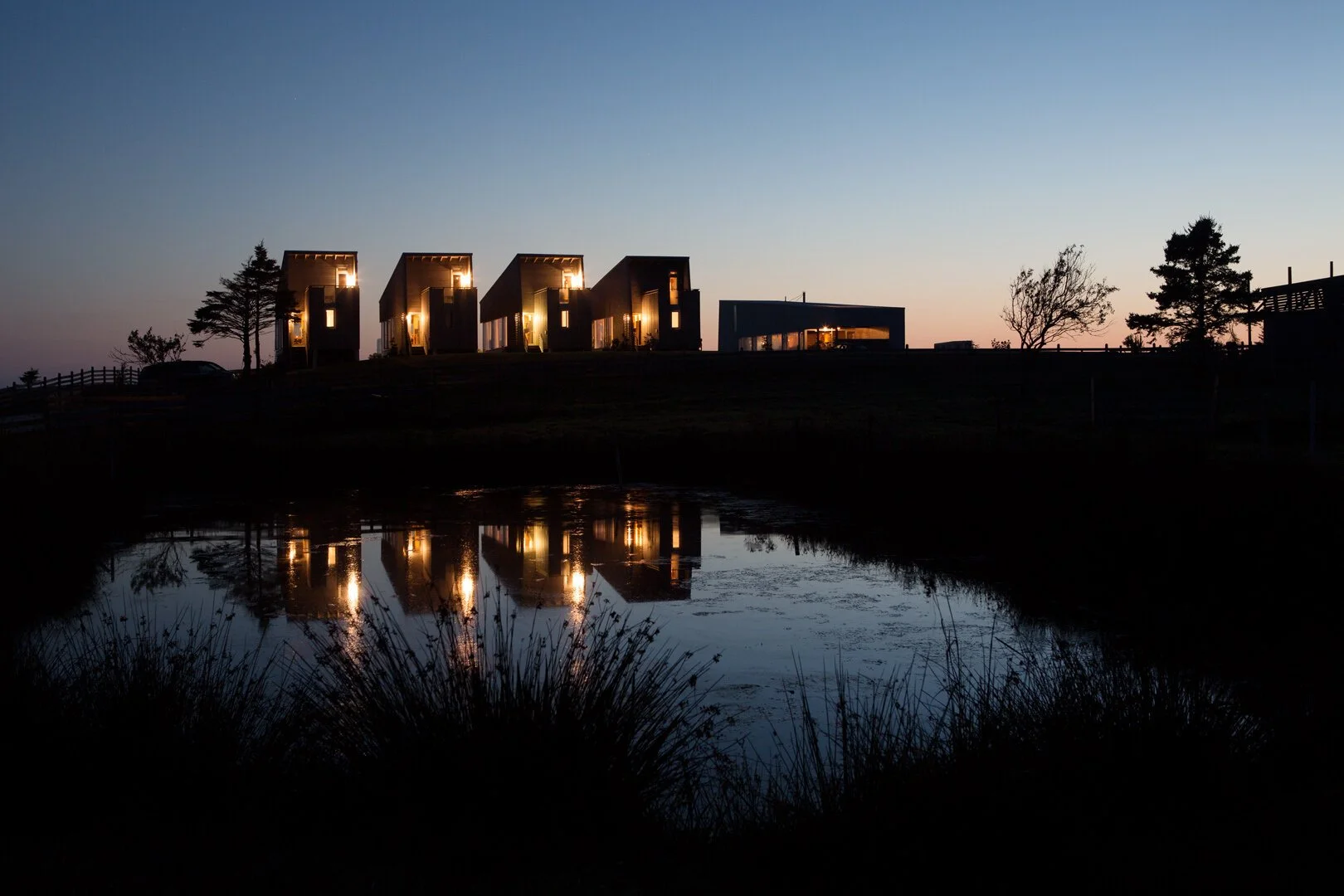 Amenities include lap pool, sauna, and gym, two hot tubs, a fire-pit by a saltwater lake, and the “sky-room,” a restored, centuries-old building foundation that now serves as an outdoor dining and lounge area. Onsite parking is provided for guests. All cabins are equipped with WiFi. Guests may use shared laundry facilities. Firewood, for the pit and the interior woodstove, is provided.